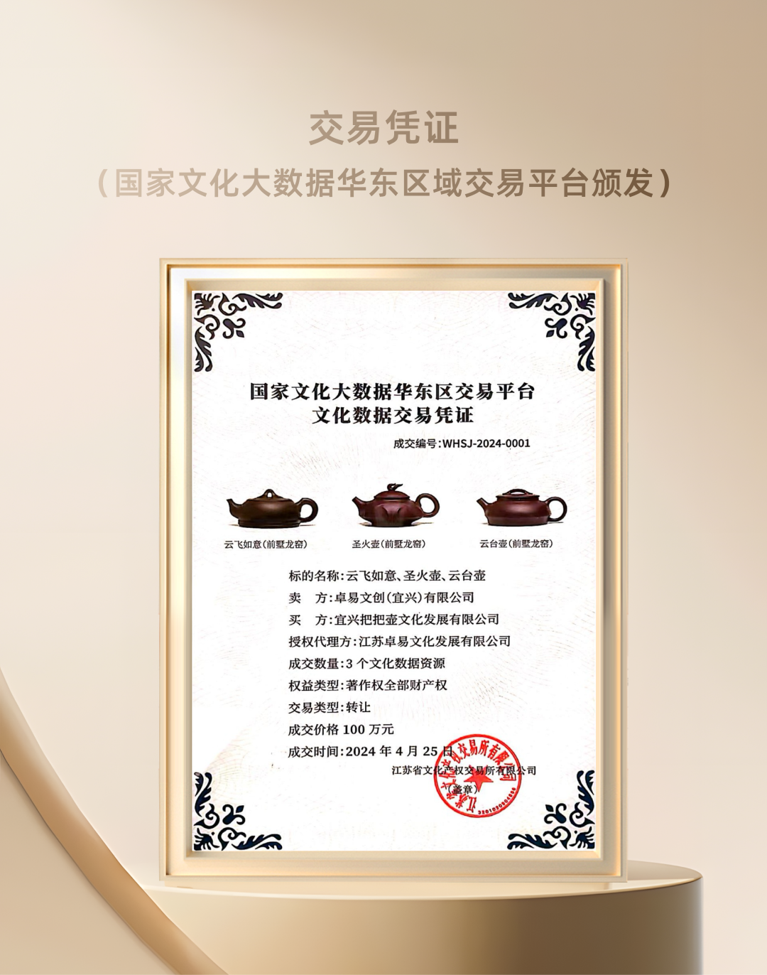值得一提的是,卓易文化与江苏省文交所联合推出紫砂・易平台,商家在上架产品前,需在国家文化大数据华东区域交易平台平台完成版权交易确权,并获得由其发放的版权交易凭证。区别于传统的如纸质合同进行版权确认与交易流转的方式,国家文化大数据华东区域交易平台所开展的版权交易确权工作,极大地降低了版权交易过程中的风险与不确定性。这种创新的合作模式对于紫砂・易平台而言,它从源头上确保了平台上所有上架产品的版权合法性与真实性,使得平台能够在合法合规的轨道上稳健运行。