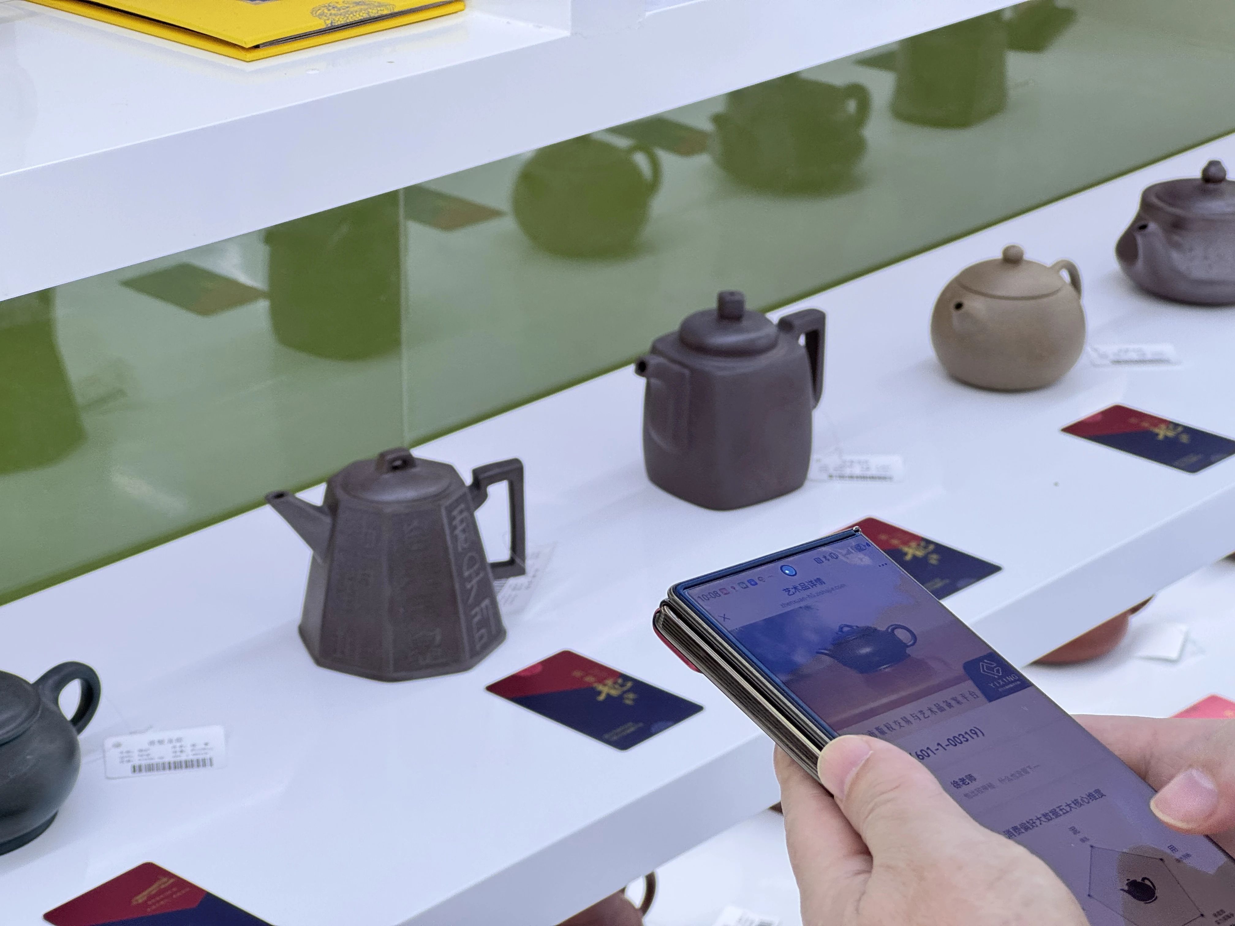 卓易文化的“王牌技术”就是依托江苏省“紫金链”为每把紫砂壶做一张独一无二的“数字身份证”,从泥料、作者、制作工艺、流通价格全程记录,生成专属二维码,扫码就能看到产品的“出生档案”。目前“紫砂数字基因库”流动着6000多万产品信息,让“买带身份证的紫砂壶”成为消费共识。“过去消费者买紫砂壶因缺乏专业知识而犹豫,如今扫码即可追溯查询,告别凭运气买真品的时代”现场工作人员介绍道。